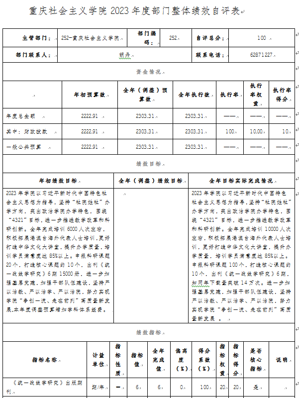 根据预算绩效管理要求,我部门对部门整体和5个一级项目开展了绩效自评,涉及财政拨款项目支出资金791.12万元。从评价情况来看,本年度财政资金全部到位,保障了教学、科研、《统一战线学研究》期刊出版等重点工作的推进,实现了预期绩效目标。在各项目实施过程中,本部门建立健全相关制度,提高预算执行的及时性、规范性和安全性,项目资金实行专项管理、严格审批制度、做到专款专用,确保项目资金切实为推进统一战线学术研究服务、为高质量开展统一战线教育培训和社院工作服务、为巩固和发展最广泛的爱国统一战线服务,实现了项目资金的有效利用。
