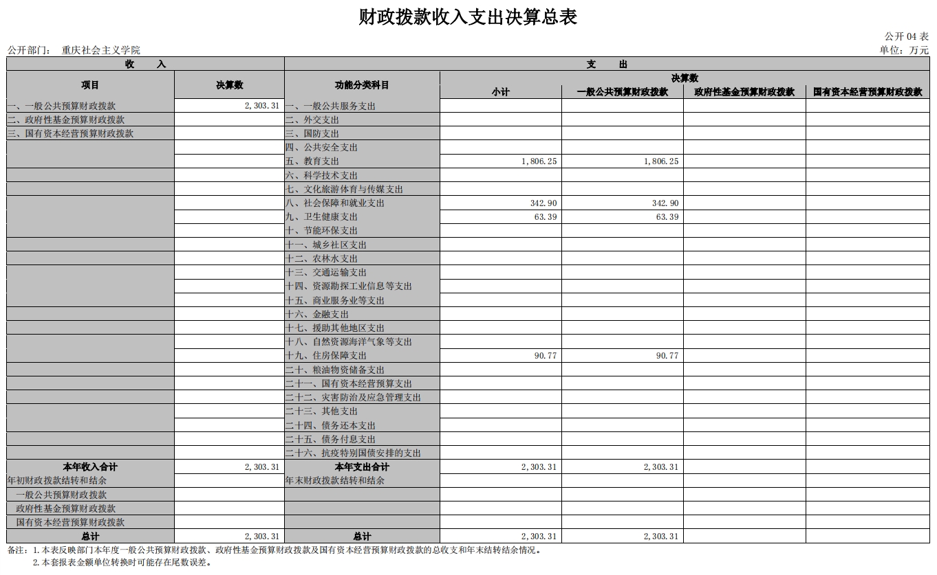 2023年度财政拨款收、支总计2303.31万元。与2022年相比,财政拨款收、支总计各增加117.01万元,增长5.35%。主要原因是新增两个项目经费:《重庆社会主义学院志》编撰工作经费80万元及学科体系经费100万元。