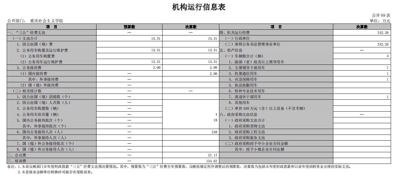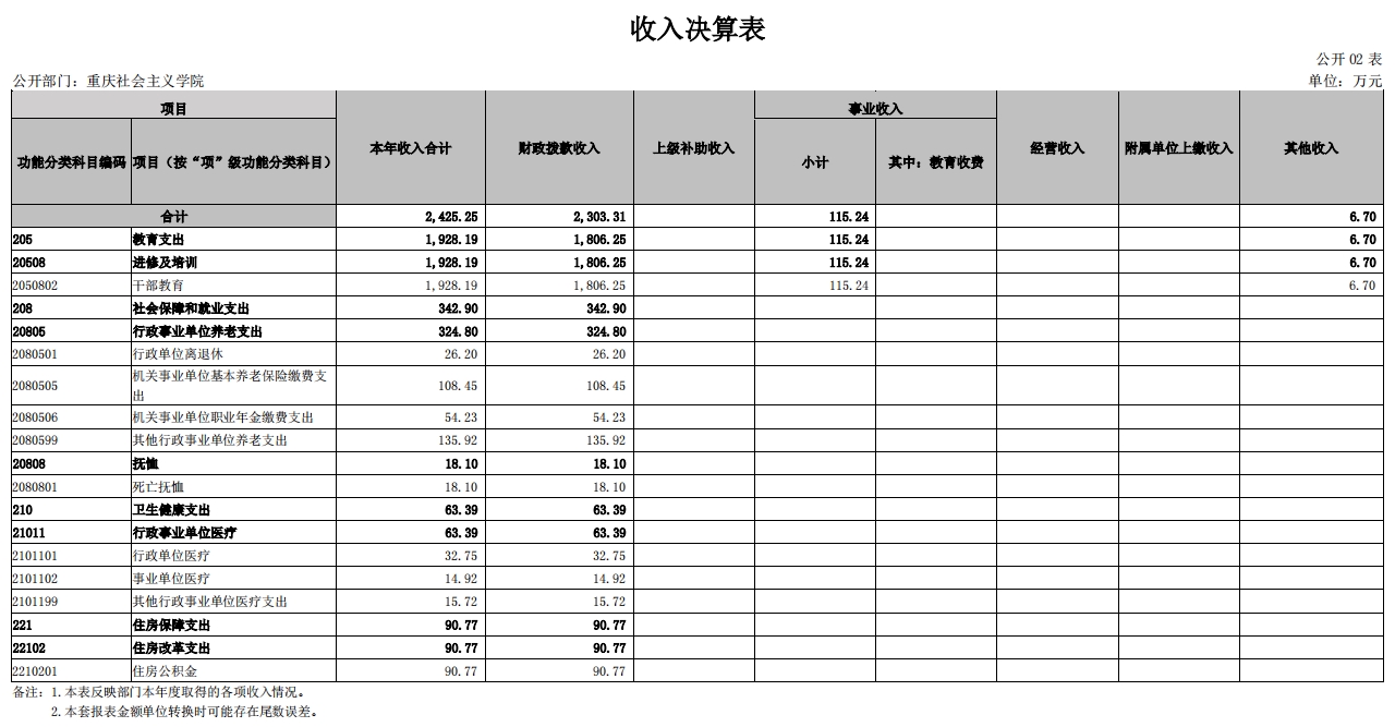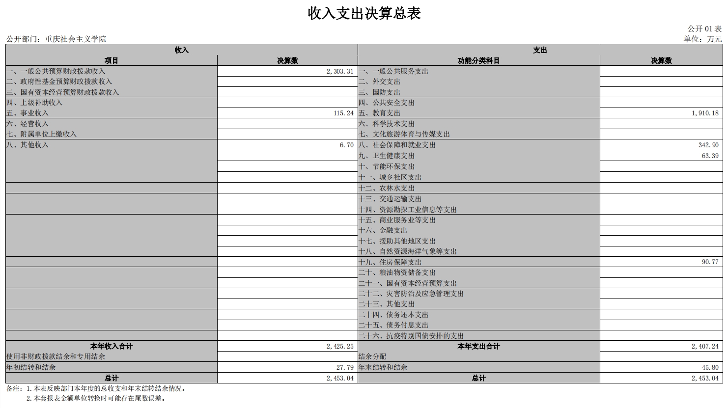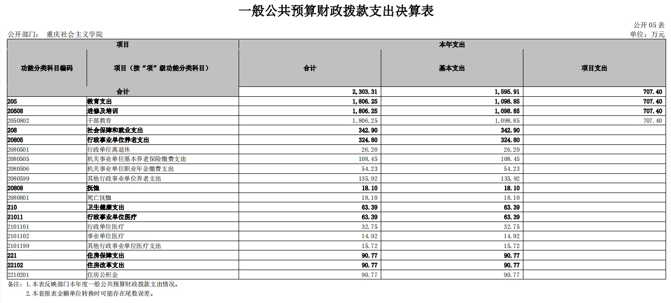 1.收入情况。2023年度一般公共预算财政拨款收入2303.31万元,较上年决算数增加190.97万元,增长9.04%。主要原因是新增两个项目经费:《重庆社会主义学院志》编撰工作经费及学科体系经费。较年初预算数增加80.40万元,增长3.62%。主要原因是年中追加学科体系经费100万元。此外,年初财政拨款结转和结余0.00万元。