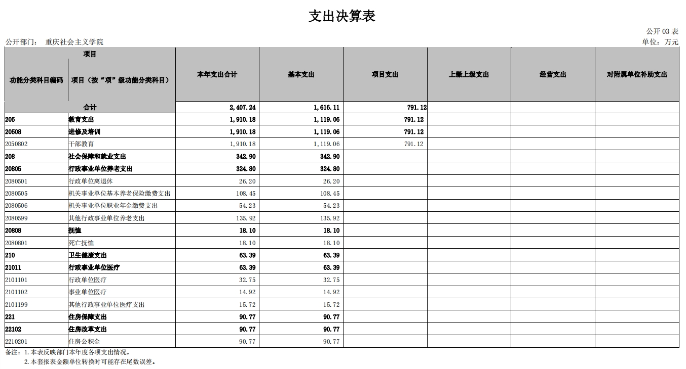 3.支出情况。2023年度支出合计2407.24万元,较上年决算数减少101.80万元,下降4.06%,主要原因是上年度支付皓月楼、建业楼消防整改和恢复工程款160.38万元。其中:基本支出1616.11万元,占67.14%;项目支出791.12万元,占32.86%;经营支出0.00万元,占0.00%。此外,结余分配0.00万元。