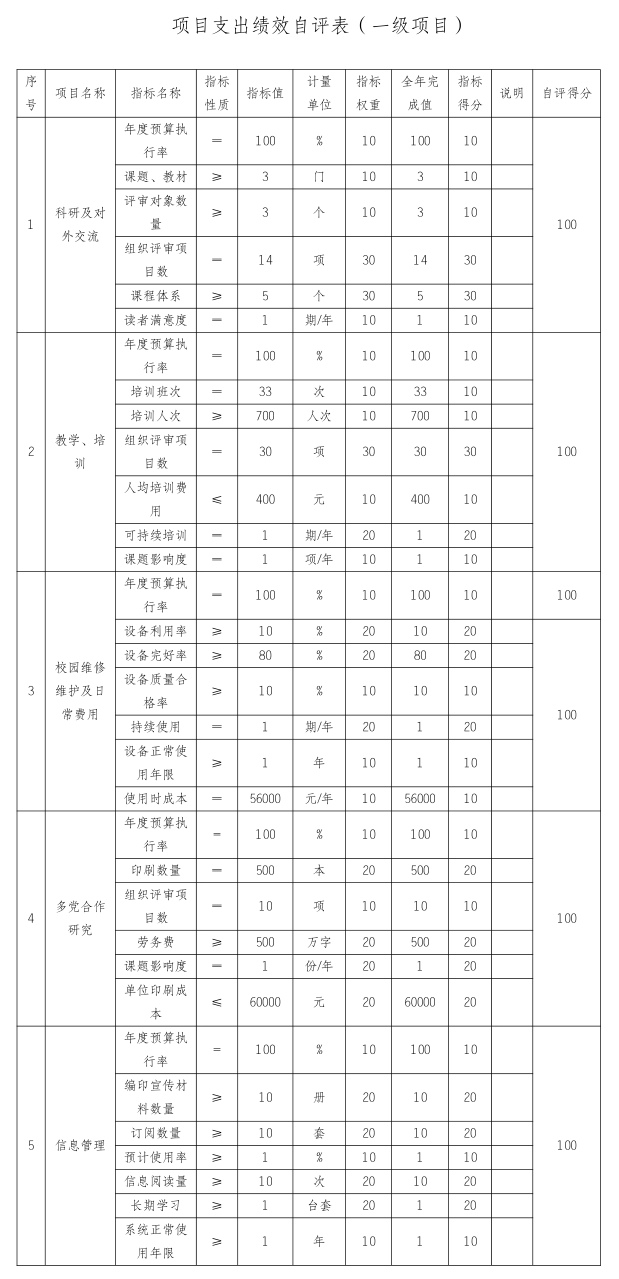 我部门对科研及对外交流项目开展了绩效评价,涉及财政拨款项目资金208万元,评价得分100分;我部门对教学、培训开展了绩效评价,涉及财政拨款项目资金192万元,评价得分100分;我部门对校园维修维护及日常费用开展了绩效评价,涉及财政拨款项目资金108.6万元,评价得分100分;我部门对多党合作研究开展了绩效评价,涉及财政拨款项目资金130万元,评价得分100分;我部门对信息管理开展了绩效评价,涉及财政拨款项目资金20万元,评价得分100分。
